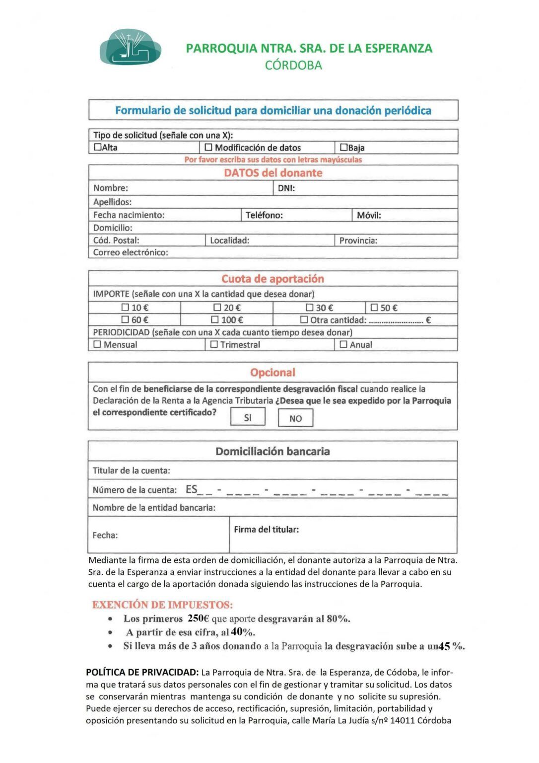 Desde el 1 de enero de 2024, se ha incrementado la deducción fiscal de los donativos (Real Decreto 6/2023 de 19 diciembre) a las entidades sin ánimo de lucro. De esta manera, los primeros 250€ donados (en el conjunto de sus donativos realizados como contribuyente en el año fiscal) desgravarán un 80% y si su donación es igual o superior a las donaciones efectuadas en los dos años anteriores a la Parroquia de Ntra. Sra. de la Esperanza de Córdoba, el resto de su desgravación será del 45%. En otro caso, el resto de sus donativos desgravarán un 40%.